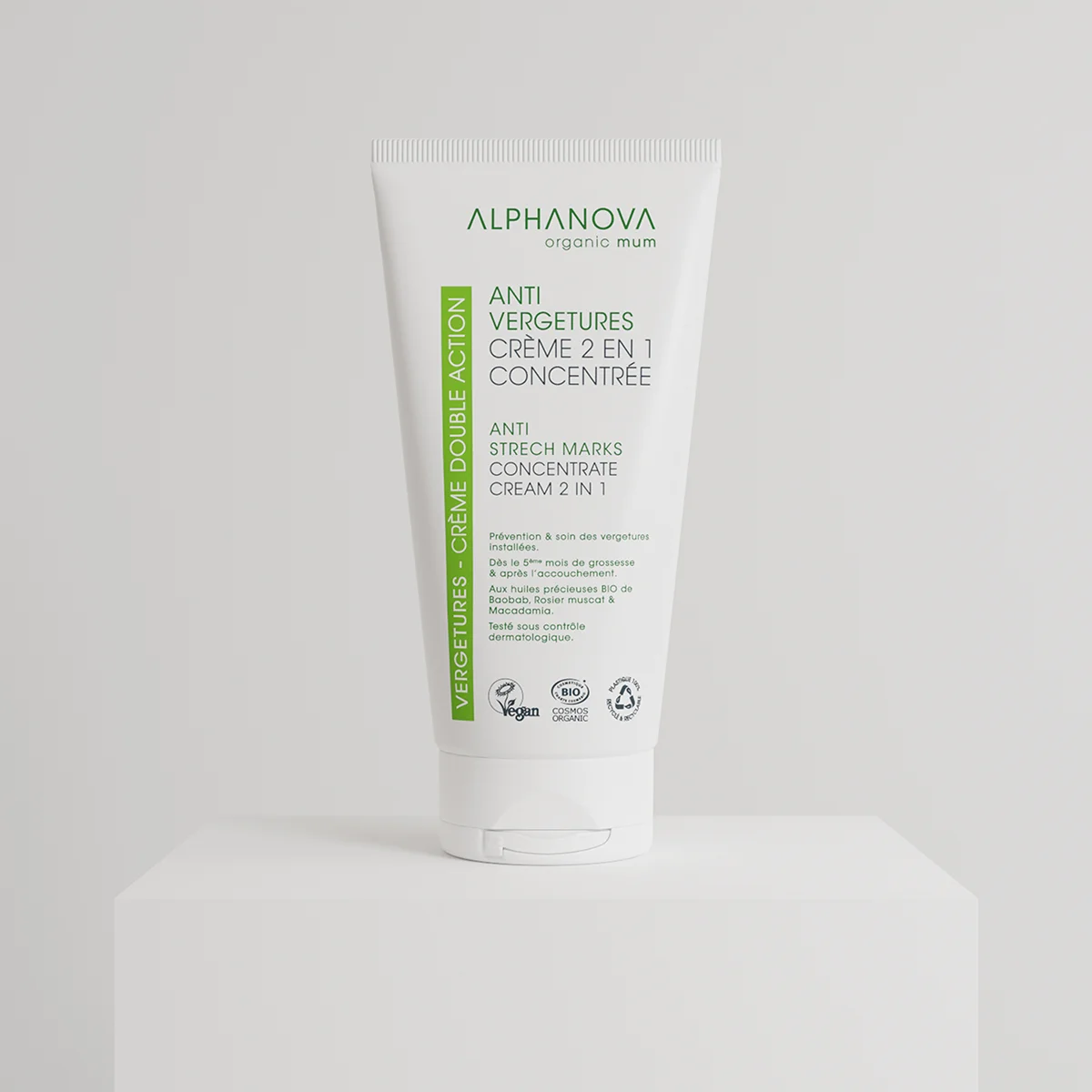 La Crème 2 en 1 Concentrée Anti-Vergetures de la marque Alphanova est un soin cosmétique innovant, naturel, certifié biologique, sans paraben ni perturbateurs endocriniens, destiné à la prévention et au soin des vergetures.